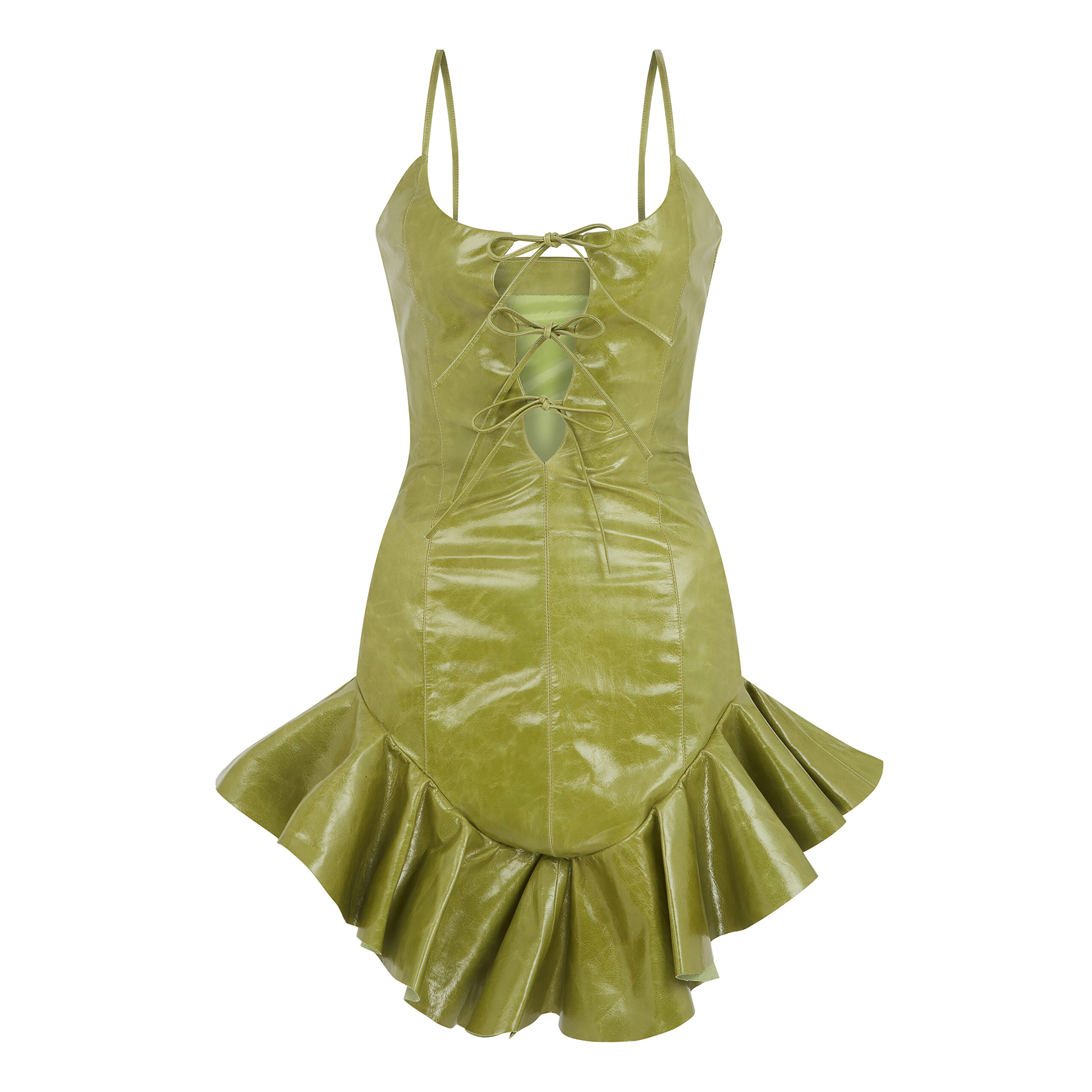Indulge in the allure of our leather corset dress, a statement piece that defines sophistication. This dress boasts a seductive lace-up front and a flirtatious ruffled hem, creating a stunning silhouette. Its luxurious leather composition ensures a perfect contour fit. Ideal for a glamorous soirée, this piece can be styled with heels and minimal accessories for a statement ensemble.